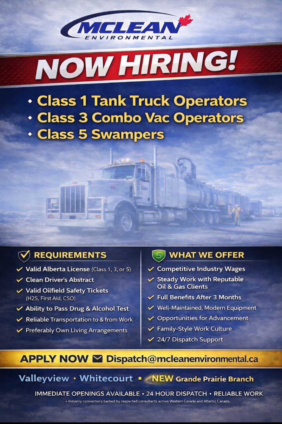 Join our Team.McLean Environmental is a fast growing ma and pa Oil and Gas services company. We have a preference to hiring local to the area employees and a good percentage of our staff is composed of great local talent. If you have a strong work ethic and are safety minded, we encourage you to submit a resume to: careers@mcleanenvironmental.ca